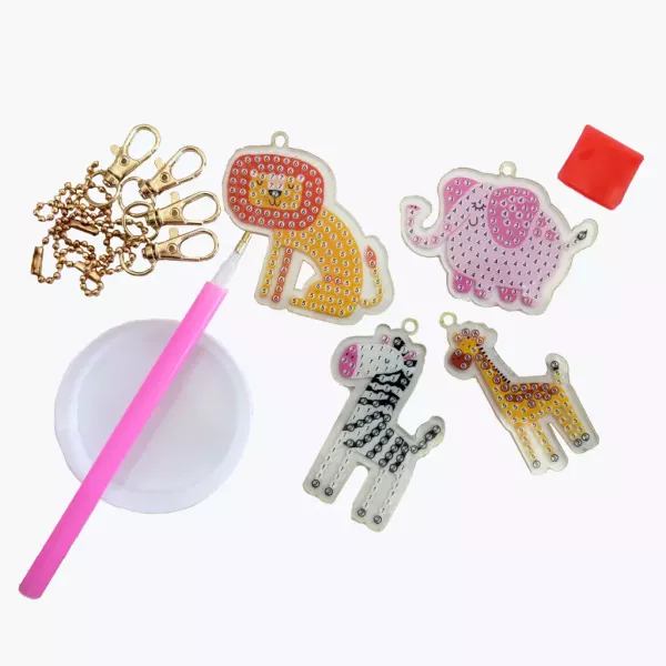 gemas brillantes, 1 lápiz aplicador, 1 cera de 2x2, bandeja, 4 figuras de animales listas para decorar, 4 abrojos para sujetar y 4 cadenas para que nunca pierdas tus llaves